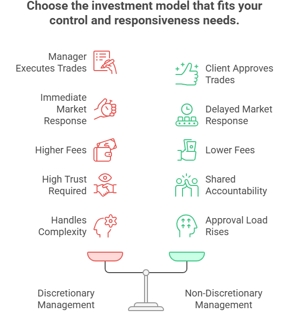 The trade-off is investment control. You are relying on trust, process, and oversight rather than direct client approval. Discretionary portfolio management can also come with higher minimums or higher fees because the manager is taking on more responsibility and a more operationally demanding service model.
