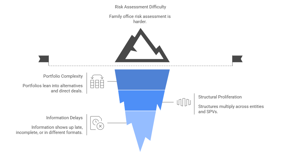 Alternatives and direct deals do not just add complexity. They change the timing and quality of the information you rely on, which makes family office risk assessment harder even when the underlying assets are solid. You are often working with valuation lag, uneven reporting, and exposures that do not show up cleanly until after decisions have already been made.