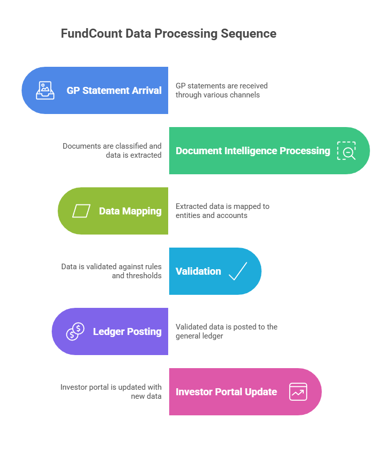 Quarter-end moves when five things happen in sequence. First, documents get collected from portals and monitored inboxes without staff chasing links. Second, the PDFs are turned into structured fields that match capital accounts, cash flows, fees, carry, and FX. Third, those fields get validated against rules and prior periods so exceptions surface early. Fourth, postings hit the general ledger with the right entities and accounts. Fifth, balances and source documents reach stakeholders in a portal that they will actually use. Miss any step and the lag returns.