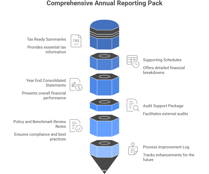 Annual reporting pack checklist includes tax ready summaries and supporting schedules, year end consolidated statements, audit support package, policy and benchmark review notes, and a process improvement log for the coming year.